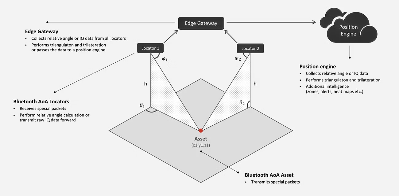 - アセットが、(TX)自身の位置情報を、ワイヤレスアクセスポイント(AP)、コネクテッド照明、またはスマート照明として AoA ロケーターへと放映します。